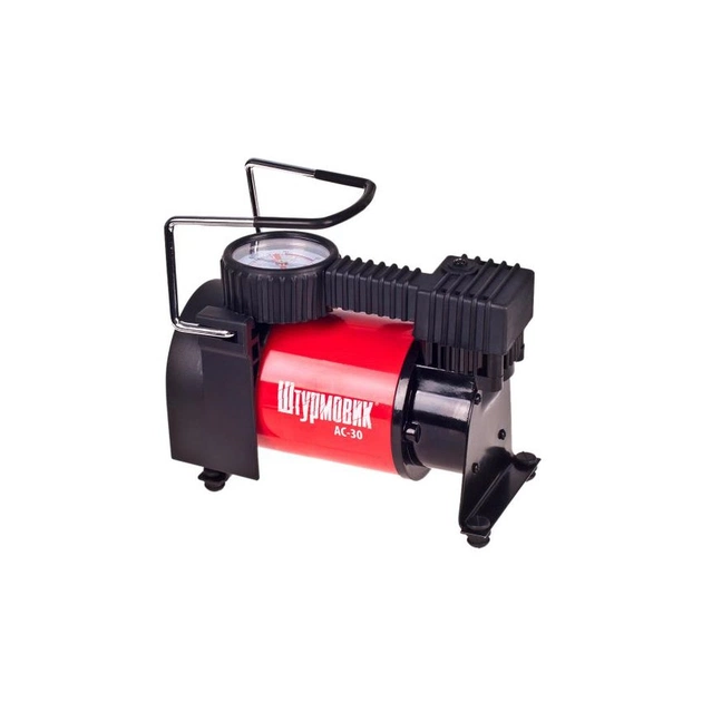 Автомобільний компресор Штурмовик АС-30 розроблений професіоналами автомобільного ринку спеціально для українських покупців. Лінійка компресорів Штурмовик - це можливість для покупця платити лише за якісний товар усередині, а не за упаковку. Ці ідеї були втілені у компресорі Штурмовик АС-30. Під металевим корпусом прихований електродвигун поршневого типу з продуктивністю 35 л/хв і потужністю 150 Вт, що споживає 12 А постійного 12 В струму від роз'єму прикурювача в автомобілі. Якісні комплектуючі дозволяють за 2 - 3 хвилини накачати колесо вашого автомобіля і зберігають продуктивність навіть при високому стартовому тиску колеса, що накачується. Модель АС-30 є однією з найпопулярніших моделей у лінійці за рахунок невеликих розмірів, потужного двигуна та підключення до роз'єму прикурювача.