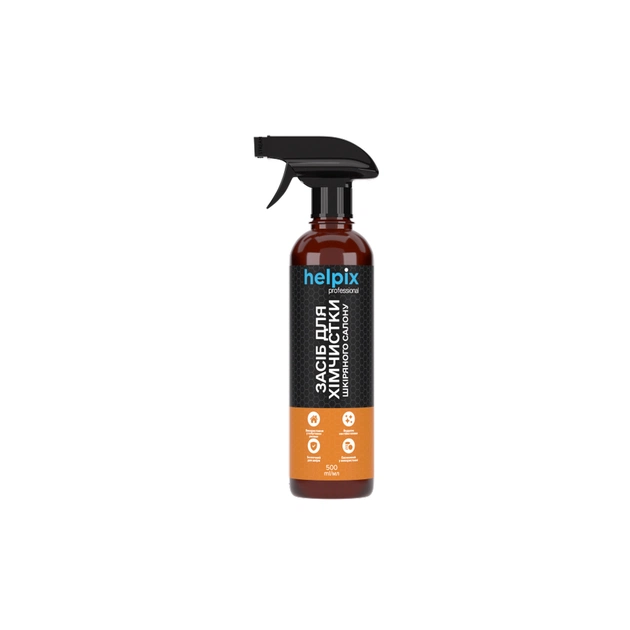Засіб для хімчистки шкіряного салону Helpix Professional 500 ml – це готовий до застосування чистячий розчин, що призначений для видалення поверхневого бруду (потожирових нашарувань, пилу, залишків кондиціонерів) і нестійких плям з елементів салону авто та меблів, що виготовлені з натуральної та штучної шкіри покривного фарбування, шкірозамінника, поліуретану та вінілу. «Засіб для хімчистки шкіряного салону» також може використовуватися для чищення взуття та інших шкіргалантерейних виробів з вищевказаних матеріалів. Засіб має близький до нейтрального pH та містить гліцерин, що забезпечує дуже делікатну чистку і зволоження шкіри. Може використовуватися без додаткового змивання з поверхні. Засіб виготовлено з європейської сировини, яка затверджена міжнародними сертифікатами якості. Якість товару підтверджено Сертифікатом ISO 9001:2015.