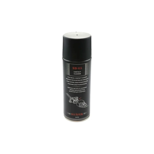 SHAFER SD65 - спеціальний засіб для швидкої і ефективної чистки і знежирення забруднених і іржавих електричних контактів будь-яких типів. Усуває оксиди, змазка і забруднення. Підвищує електропровідність контактів і стабілізує напругу. Витісняє вологу і створює водовідштовхувальну плівку. Нейтральний по відношенню до пластиків, гуми і лаків. Застосовується для догляду та технічного обслуговування всіх електричних контактів, штекерних з'єднань, клем, розподільних пристроїв запалювання, перемикачів, контактів акумулятора, аудіо-обладнання автомобіля і т.д.