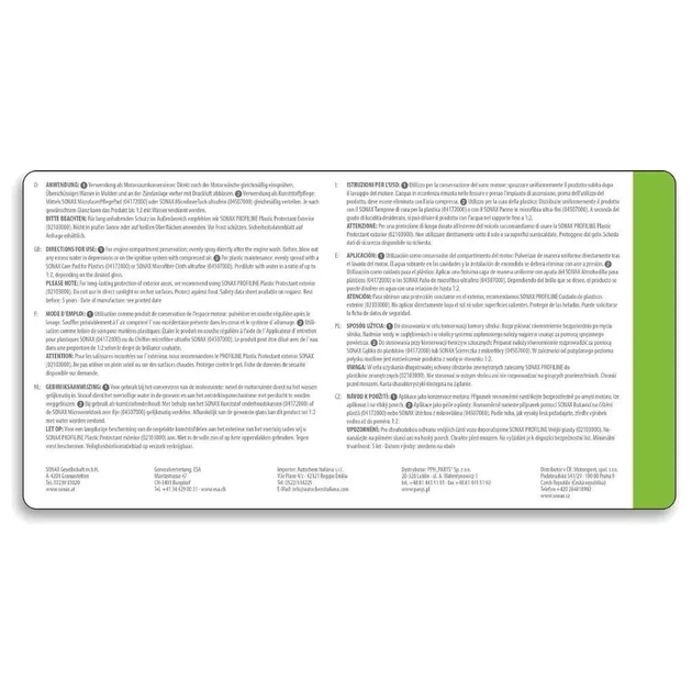 Професійний засіб з догляду для пластику Sonax PROFILINE Plastic Care рекомендований для використання на автомийках, у детейлінгових центрах та інших місцях, що миють, полірують та доглядають за автомобілем. Ефективно освіжає колір пластику, надає легкий блиск і приховує потьмарення та дрібні подряпини. Захищає всі пластикові елементи в салоні автомобіля. Є оптимальним консервантом для пластикових деталей у моторному відсіку. Рекомендується використовувати засіб відразу після миття двигуна. Не містить розчинників. Може також використовуватися для зовнішніх пластикових елементів автомобіля (бампер, молдинг, корпус дзеркала заднього огляду тощо). Для зручного користування рекомендуємо використовувати розпилювач SONAX Spray Bottle (499700) на 600 мл та аплікатор із мікрофібри для шкіри та пластику SONAX Microfaserpflegepad (417200).