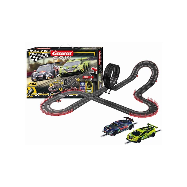 Набір Carrera GO! Суперкари DTM (DTM - чемпіонат з автоперегонів у Німеччині) переносить захоплюючий світ DTM прямо у ваш будинок: Audi R8 LMS GT3 Evo II DTM "R. Feller, № 7" та Lamborghini Huracán GT3 Evo II "Mirko Bortolotti, № 92" змагаються один з одним на трасі.