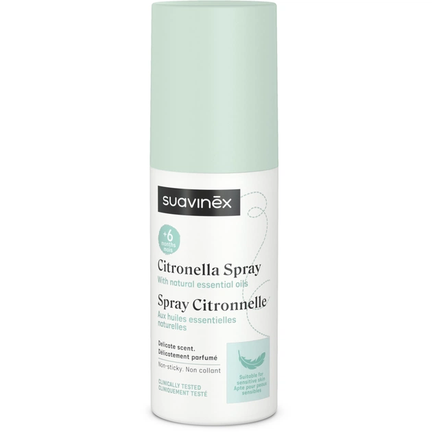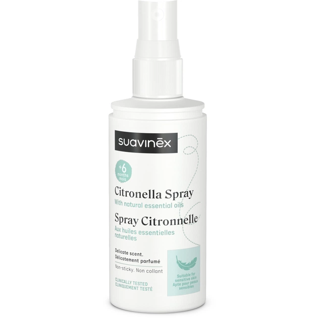 Спрей від комарів Suavinex Citronella 100 мл, зволожує та живить, розроблений для чутливої шкіри, ідеально підходить для вагітних жінок та дітей від 6 місяців.