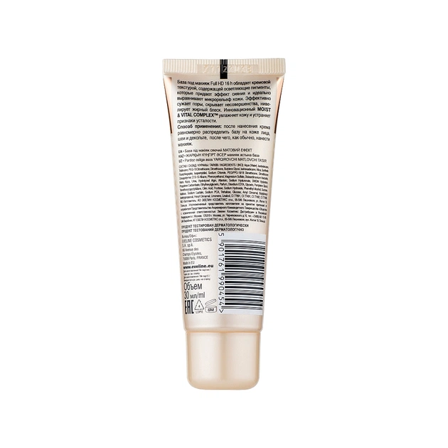 Основа під макіяж Full HD 16 h має кремову текстуру, що містить освітлювальні пігменти, які надають ефект сяйва й ідеально вирівнюють мікрорельєф шкіри. Ефективно звужує пори, приховує недосконалості, нівелює жирний блиск.