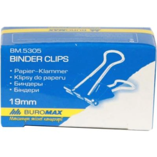 Представлені тут біндери чорного кольору від Buromax, мають розмір 19 мм, виготовлені з якісного металу, не гнуться, мають не дуже тугий затиск, і поставляються в упаковці з картону по 12 штук в кожній. Біндери дозволять не витрачати час на пошуки палітурки для скріплення ваших документів, а при необхідності, можуть бути швидко зняті не завдаючи шкоди паперу.