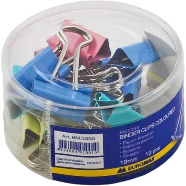 від Buromax, мають розмір 19 мм, виготовлені з якісного металу, не гнуться, мають не дуже тугий затиск, і поставляються в упаковці з картону по 12 штук в кожній. Біндери дозволять не витрачати час на пошуки палітурки для скріплення ваших документів, а при необхідності, можуть бути швидко зняті не завдаючи шкоди паперу.