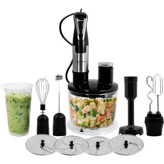 У комплектації блендера Liberton LHB-0312 є все необхідне для реалізації кулінарних задумів. Насадка-блендер і насадка-вінчик ідеально підходять для змішування та збивання, забезпечуючи ніжну текстуру кремів та пюре. Базовий набір аксесуарів включає міксерну насадку і гак для тіста, що дозволять перемішувати та замішувати різні типи тіста з максимальною ефективністю.