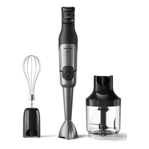 Три режими роботи — блендер, збивання, подрібнення — відкривають майстерність у кожному русі. Блендер оснащений насадкою-вінчиком для ідеального збивання вершків чи приготовлення майонезу, в той час як подрібнювач з ємністю 500 мл дозволяє швидко обробляти цибулю, зелень чи горіхи. Зручний чопер додає комфорту при нарізці овочів.