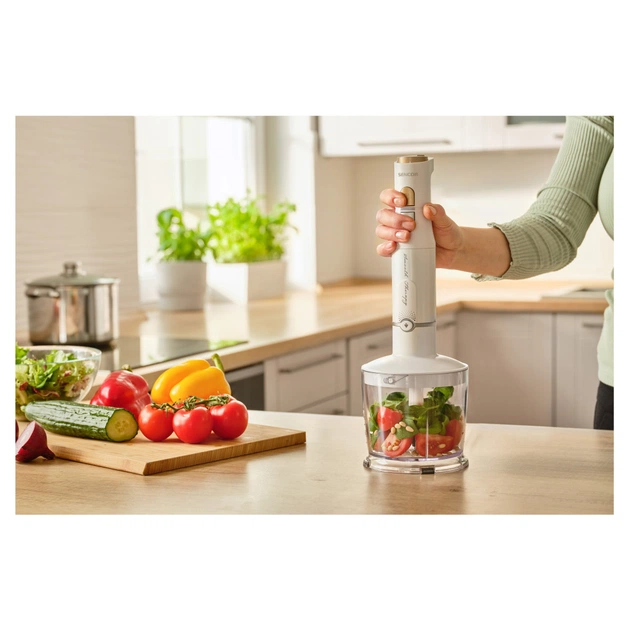 Однією з ключових переваг цього пристрою є його універсальність. Він оснащений не лише стандартною насадкою для блендера, а й набором додаткових накінечників: міксером, спінювачем молока, насадкою для пюре, ножем для подрібнення. Це дозволяє реалізувати всі ваші кулінарні фантазії, лише змінивши насадку. Завдяки функції подрібнювача з ємністю 500 мл можна швидко підготувати соуси, муси або перетерти горіхи. Перевага Sencor SHB6441WH також полягає в додаткових ємностях: мірний стакан на 0,8 літра та практичний чопер.