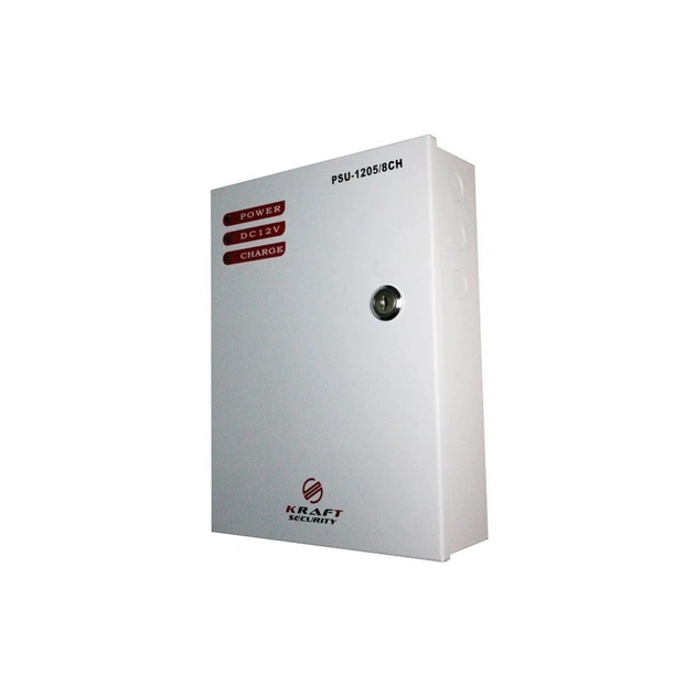 PSU-1205/8CH - це імпульсний восьмиканальний джерело безперебійного живлення, який здійснює подачу резервного живлення для таких пристроїв як відеокамери, електронні замки, кодові клавіатури, обчислювачі, контролери, сирени, охоронні датчики та багато інших пристроїв, які мають вхідна напруга 12В. Максимальний вихідний струм на один канал становить - 0,6 А. Габарити боксу дозволяють встановити всередину акумуляторну батарею до 7 Ач. Має захист від короткого замикання, підключення невірної полярності АКБ, глибокого розряду АКБ, тепловий захист.