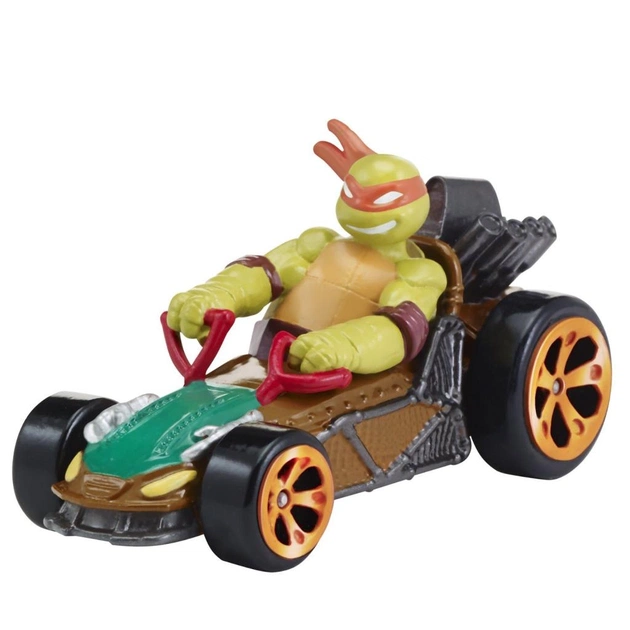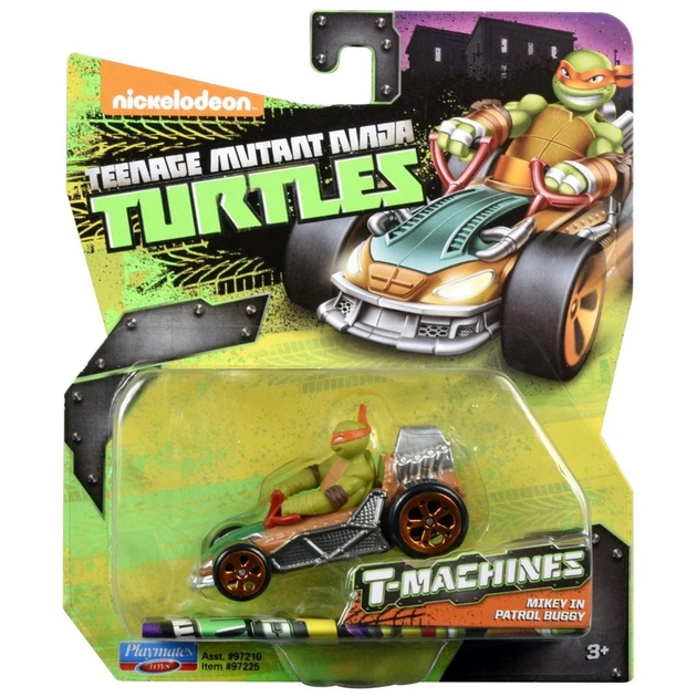 Бойовий транспорт TMNT Черепашки-Ніндзя Мікеланджело в патрульному баггі (97225) - це унікальні автомобілі, створені Черепашками. Кожен вид транспорту має металеву основу, яскраві диски коліс, свого унікального героя. Ви можете зібрати всю колекцію міні-транспорту. Фігурка незнімна. Для дітей у віці старше 3-х років.