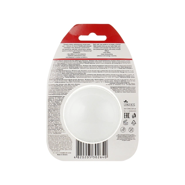 Дозвольте собі частинку розкоші та бездоганного розслаблення з бомбою для ванни Romance бренда Nature Code. Шикарний б'юті-продукт дозволить вашій рутинній водній процедурі заграти новими фарбами, збагачуючи воду корисними речовинами й пом'якшуючи її. Натуральні компоненти повертають епідермісу чистоту, шовковистість і м'якість, заповнюючи дефіцит живильних мікроелементів у глибоких шарах, а шикарний аромат гарантує романтичний настрій, який покращується з кожним новим розпусканням пелюсток, що знаходяться усередині бомби.