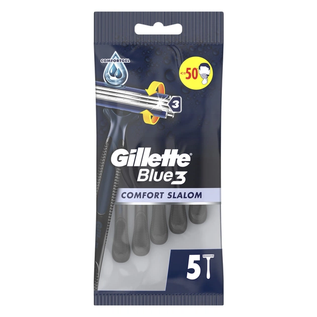 До 10 процедур комфортного гоління однією одноразовою бритвою? Таке можливо з Gillette Blue 3 Comfort Slalom, оснащеною трьома незалежно підвішеними лезами з хромовим покриттям і головкою, що плаває, яка повторює контури обличчя.