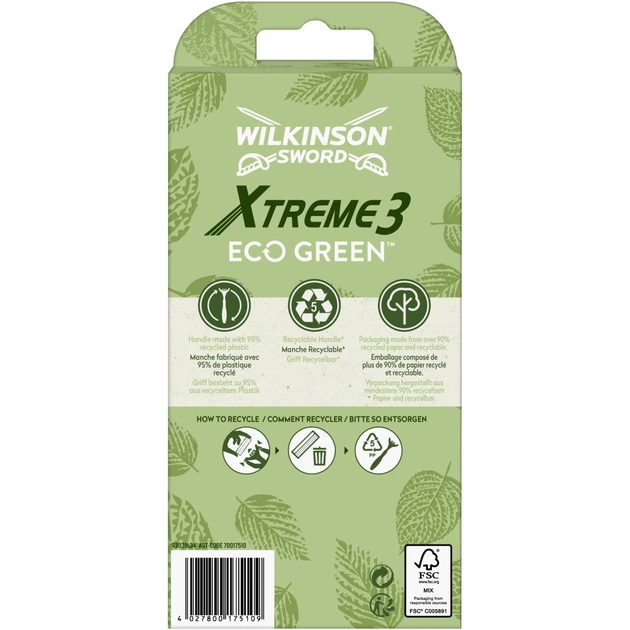 Wilkinson Sword Xtreme3 Eco Green — одноразові бритви серії Xtreme3 забезпечують м'яку та гладку шкіру, водночас піклуючись про довкілля.