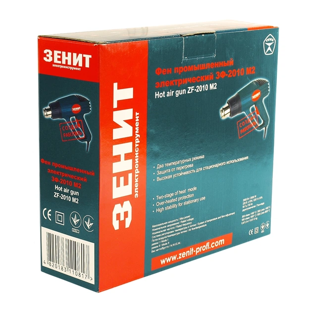 Промисловий фен Зеніт ЗФ-2010 М-2 виконує різноманітні будівельні завдання: паяння, формування виробів із ПВХ, усадка кабелів, розморожування, закладення швів, видалення фарби. має максимальну потужність 2000 Вт, два температурні режими, суміщені з двома режимами швидкості повітряного потоку. У першому режимі фен нагріває повітряний потік до 380 °C за швидкості потоку 300 л/хв. У другому режимі температура потоку досягає максимальної позначки 500 °C, за швидкості потоку 500 л/хв.