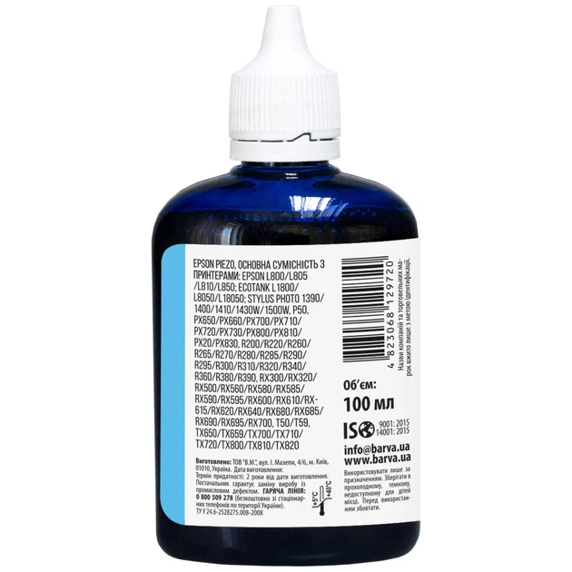 Сублімаційні чорнила – спеціальний тип чорнил, що використовується для перенесення зображень на текстиль, метал, кераміку, пластик і т.д. Чорнило сумісне для настільних принтерів Epson 100 мл, сублімаційне, світло-блакитне Barva (SUB-916) використовується для заправки настільних принтерів Epson. Чорнила SUB-916 Barva мають офіційну гарантію – АТ000953. При виборі чорнила Вам також необхідно звернути увагу на колір картриджа, який плануєте заправляти. Ці чорнила Barva мають колір – light cyan (світло блакитний). Виробник гарантує безперебійну роботу чорнил протягом всього терміну використання, який складає – 2 роки. Тип чорнил SUB-916 Barva – Сублімаційні. Українська компанія ТОВ «В.М.» виготовляє чорнила під торговою маркою Barva вже багато років. На базі власної лабораторії відбувається як розробка нових формул, так і неперервний контроль якості продукції, що випускається. При виробництві чорнил виробник слідує стандартам ISO 9001:2015 та ISO 14001:2015. Для досягнення найкращого результату в передачі кольору та стійкості до світла ми рекомендуємо використовувати комбінацію – Спеціальний папір для сублімаційного друку Barva + чорнила Barva. Дана фарба для принтера Epson Barva має фасовку – 100 мл, що має наступні особливості: Чорнила для принтера Epson SUB-916 Barva 90 гр./100 мл розфасовані в спеціальні флакони для зручної заправки; Ретельно підібраний поліетиленовий флакон має зручну насадку-носик, яка дозволяє легко заправити картриджі чи резервуари принтера без шприца; Невеликий об’єм чорнил ідеально підходить для користувачів, які друкують небагато; Чистота при заправці завдяки зручному флакону; Заправка в резервуар принтера: Зніміть кришку з флакону, відкрийте заглушки на резервуари з чорнилами на пристрої; Переконайтеся, що немає помилки з кольором чорнил; За допомогою носика на флаконі перелийте чорнила в ємності пристрою. Чорнила SUB-916 Barva, поради щодо використання: Підготуйте майбутній малюнок для переносу у дзеркальному зображенні. Надрукуйте тестовий аркуш для перевірки, чи все правильно зроблено. Перенесіть підготовлене зображення на необхідну поверхню за допомогою термопресу. Якщо плануєте переносити зображення на текстиль, обирайте тканину із вмістом синтетики не менше 50%. Ви можете купити Чорнило сумісне для настільних принтерів Epson 100 мл, сублімаційне, світло-блакитне Barva (SUB-916) в нашому інтернет-магазині з доставкою по Києву та всій Україні.