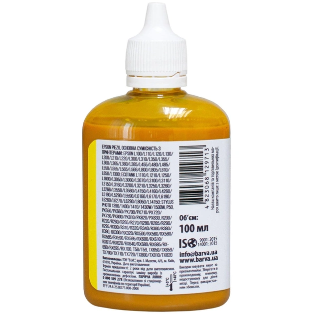 Сублімаційні чорнила – спеціальний тип чорнил, що використовується для перенесення зображень на текстиль, метал, кераміку, пластик і т.д. Чорнило сумісне для настільних принтерів Epson 100 мл, сублімаційне, жовте Barva (SUB-915) використовується для заправки настільних принтерів Epson. Чорнила SUB-915 Barva мають офіційну гарантію – АТ000953. При виборі чорнила Вам також необхідно звернути увагу на колір картриджа, який плануєте заправляти. Ці чорнила Barva мають колір – yellow (жовтий). Виробник гарантує безперебійну роботу чорнил протягом всього терміну використання, який складає – 2 роки. Тип чорнил SUB-915 Barva – Сублімаційні. Українська компанія ТОВ «В.М.» виготовляє чорнила під торговою маркою Barva вже багато років. На базі власної лабораторії відбувається як розробка нових формул, так і неперервний контроль якості продукції, що випускається. При виробництві чорнил виробник слідує стандартам ISO 9001:2015 та ISO 14001:2015. Для досягнення найкращого результату в передачі кольору та стійкості до світла ми рекомендуємо використовувати комбінацію – Спеціальний папір для сублімаційного друку Barva + чорнила Barva. Дана фарба для принтера Epson Barva має фасовку – 100 мл, що має наступні особливості: Чорнила для принтера Epson SUB-915 Barva 90 гр./100 мл розфасовані в спеціальні флакони для зручної заправки; Ретельно підібраний поліетиленовий флакон має зручну насадку-носик, яка дозволяє легко заправити картриджі чи резервуари принтера без шприца; Невеликий об’єм чорнил ідеально підходить для користувачів, які друкують небагато; Чистота при заправці завдяки зручному флакону; Заправка в резервуар принтера: Зніміть кришку з флакону, відкрийте заглушки на резервуари з чорнилами на пристрої; Переконайтеся, що немає помилки з кольором чорнил; За допомогою носика на флаконі перелийте чорнила в ємності пристрою. Чорнила SUB-915 Barva, поради щодо використання: Підготуйте майбутній малюнок для переносу у дзеркальному зображенні. Надрукуйте тестовий аркуш для перевірки, чи все правильно зроблено. Перенесіть підготовлене зображення на необхідну поверхню за допомогою термопресу. Якщо плануєте переносити зображення на текстиль, обирайте тканину із вмістом синтетики не менше 50%. Ви можете купити Чорнило сумісне для настільних принтерів Epson 100 мл, сублімаційне, жовте Barva (SUB-915) в нашому інтернет-магазині з доставкою по Києву та всій Україні.