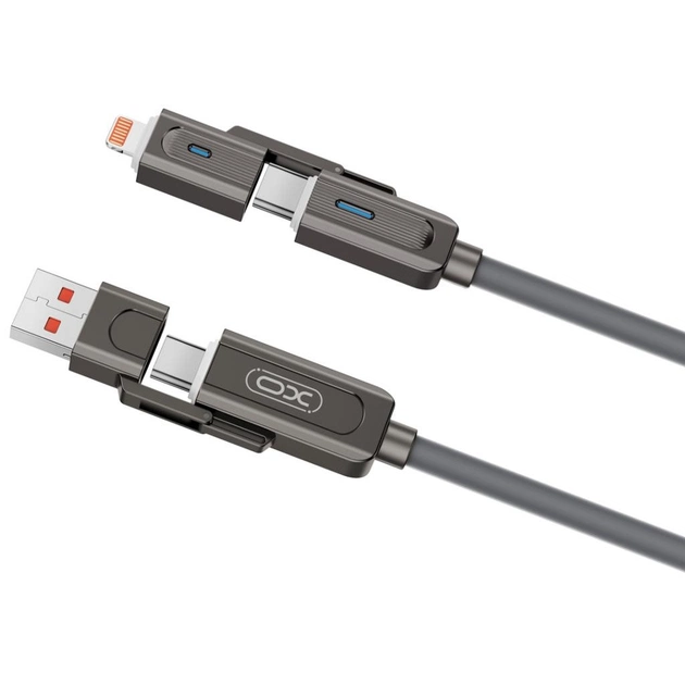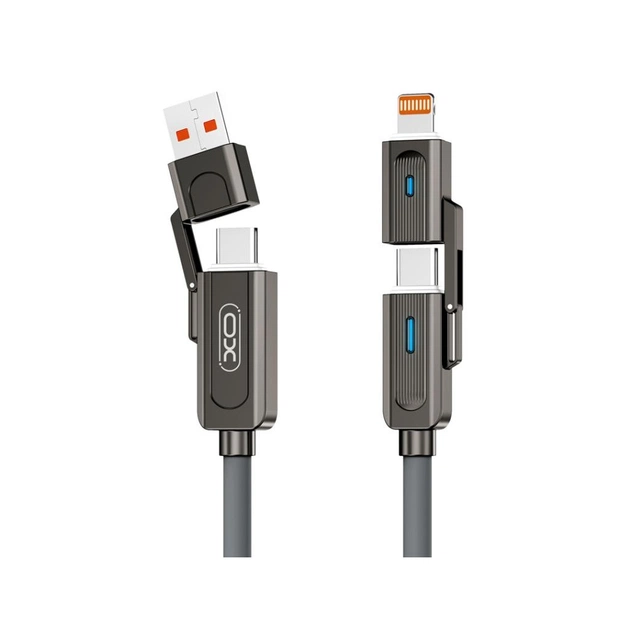 Кабель XO NB275 Zinc Alloy Silicone 4in1 — це універсальний аксесуар для зарядки та передачі даних, який поєднує в собі практичність, стиль і надійність. Завдяки наявності чотирьох роз'ємів, він ідеально підходить для користувачів, які мають кілька різних пристроїв. На вході передбачені USB Type-A та USB Type-C, що дозволяє підключати кабель до різноманітних джерел живлення, у тому числі сучасних блоків живлення, ноутбуків або павербанків.