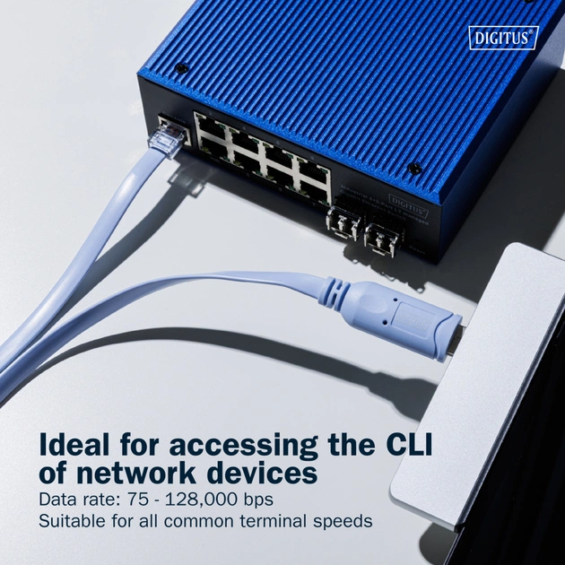 Адаптер DIGITUS DA-70173 перетворює USB 2.0 порт на консольний RJ45 для прямого підключення до мережевих пристроїв. Чіпсет FTDI FT232RNL забезпечує стабільну емуляцію послідовного порту зі швидкістю до 128 кбіт/с. Довжина кабелю 1,8 м і нікельовані контакти дають змогу зручно працювати в стійці чи на робочому столі. Підтримка всіх основних ОС відбувається після встановлення драйверів FTDI. Кабель підходить для доступу до CLI маршрутизаторів, комутаторів і контролерів різних виробників.