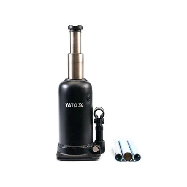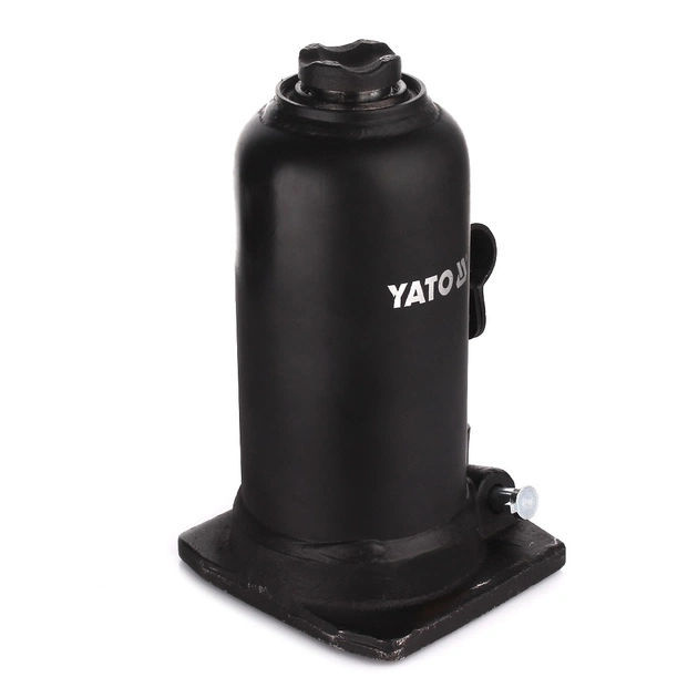 YATO YT-17001 - Домкрат гідравлічний двухштоковий, універсальний вантажопідйомний механізм. Призначений для підйому, утримання і фіксації автомобіля, в процесі проведення ремонтних і діагностичних робіт. Модель YT-1711 пляшкового типу, має максимальну вантажопідйомність 5 тон, що цілком достатньо для вантажного автомобіля чи автобуса. Перевагою даного домкрата є хороша висота підйому 500 мм і висота підхоплення 220 мм, що дозволяє розширити область застосування і ефективно виконувати ремонтні роботи. Подовжена металева приводна ручка, складаний конструкції, передає посилення на нагнітає насос, де нагнітається робоча рідина, яка забезпечує плавний хід при здійсненні підйому і опускання вантажу. Конструкція домкрата представлена в формі пляшки, корпус якого виконаний з міцного металу. Поверхня корпусу покрита спеціальним лакофарбовим покриттям, для запобігання процесу корозії металу і забезпечує тривалий термін служби пристрою. Завдяки широкій опорній поверхні, домкрат досить стійкий і захищений від бокового ковзання.