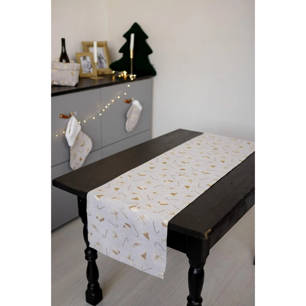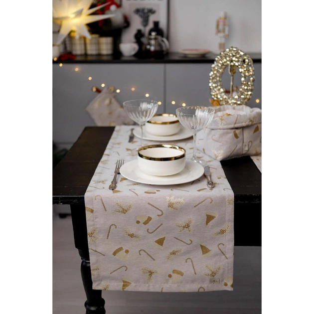 Ранер на стіл відмінно поєднується з текстилем з новорічної колекції Шапочки та Дзвіночки.