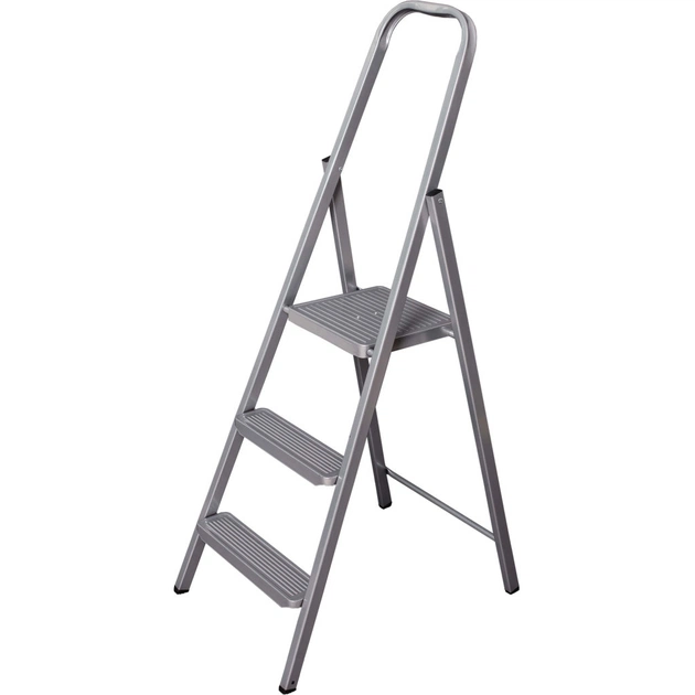 Надійна та стійка сталева драбина. Захисне епоксидне покриття робить виріб більш зносостійким. Ребриста поверхня сходинок протидіє ковзанню. Висока ручка надає додаткової зручності, дозволяючи відчувати себе безпечніше на висоті. Система складання забезпечує компактність та легкість у зберіганні.