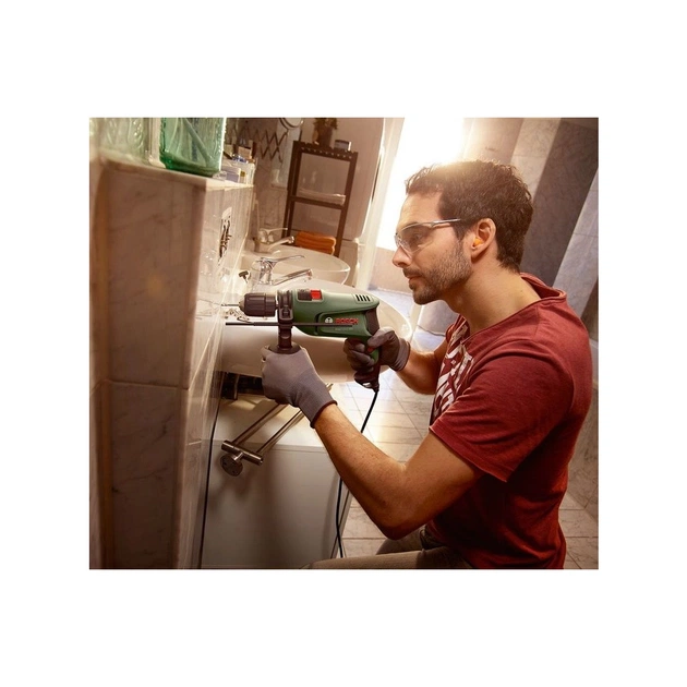 - Ударний дриль оснащений системою Bosch Electronic Speed Control, яка керує швидкістю під час свердління.