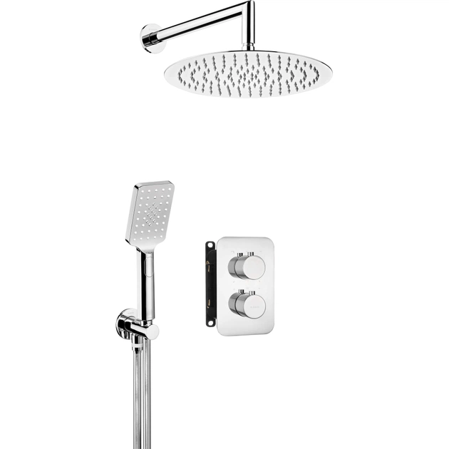 Комплектна душова система для прихованого монтажу серії Box від Deante у хромованому кольорі, складається з двох душових гарнітур та термостатичного змішувача прихованого монтажу для душу.