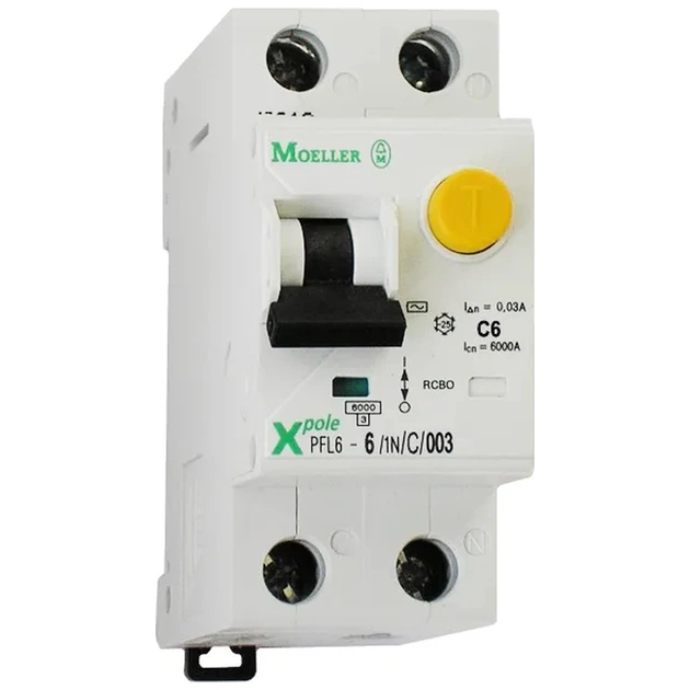 Диференціальні автоматичні вимикачі серії PFL6 - це електромеханічні комутаційні прилади з кількістю полюсів 1 + N і відключає здатністю 6 kA, що поєднують в собі функції УЗО (захист від ураження електричним струмом) і автоматичних вимикачів (захист від перевантаження і короткого замикання). Диференціальний Автоматичний вимикач EATON PFL6-16/1N / C/003 - 1+N-полюсний Автоматичний вимикач із захисною характеристикою "C". Призначений для розеткових ліній житлових приміщень з можливістю підключення ручного електроінструменту, Для розеткових ліній гаражів, майстерень без потужного електроінструменту. Номінальний струм 16 А, номінальний струм витоку 0,03 А, відключає здатність 6 kA. Є функція перевірки працездатності УЗО клавішею " T " (необхідно проводити не рідше разу на місяць). Морозостійкий. Кріпиться на DIN-рейку за допомогою трьохпозиційної засувки. Є напрямна захисна шторка для запобігання попадання кабелю під клему.
