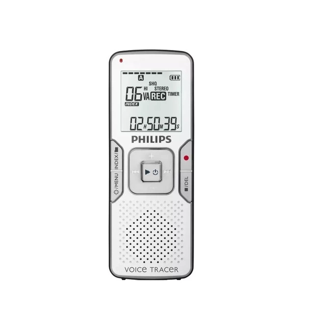 Philips Digital Voice Tracer 662 — це передовий, стильний та практичний спосіб організувати своє життя. Все що вам потрібно - це два гігабайти пам’яті, зручна функція будильника та безкоштовний мікрофон на петлиці. Записуйте нотатки та відтворюйте улюблену музику. Зберігайте свою музичну колекцію та завантажені пісні на своєму Digital Voice Tracer. Підтримується відтворення музичних форматів WMA та MP3. Запис за допомогою голосової активації — це зручна функція для запису в режимі hands-free. Після ввімкнення запис розпочнеться автоматично, коли ви почнете говорити. Записи автоматично зупиняються після того, як ви припините говорити, і автоматично відновлюються, коли ви знову почнете говорити. Акумулятори вашого Voice Tracer можна заряджати від ПК. Великий графічний дисплей дозволяє переглядати всю важливу інформацію про файли з першого погляду завдяки підсвічуванню, навіть за умов поганого освітлення. Натисніть і утримуйте кнопку запису протягом хвилини, щоб увімкнути Digital Voice Tracer і миттєво розпочати запис. Легка гарнітура, розроблена для комфорту під час тривалого використання, та всеспрямований петличний мікрофон доповнюють ваш Voice Tracer. Висока чутливість мікрофона забезпечує чудову якість запису, а стереогарнітура забезпечує потужний звук. Маленька та легка, ви майже не помітите, що вона з вами. Покладіть її в кишеню або сумку та беріть куди завгодно. Міцний корпус та привабливий ергономічний дизайн змусять вас захотіти брати її з собою куди завгодно.