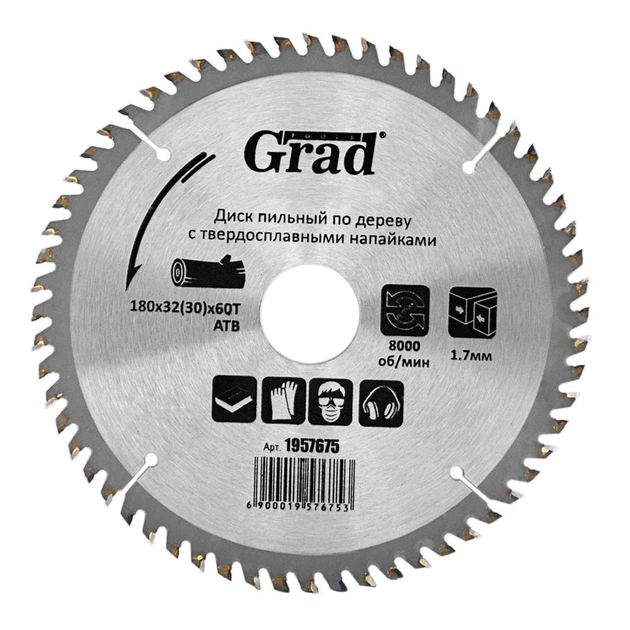 Диск пильний Grad по дереву з твердосплавними напайками Ø180×32(30)×60Т, 8000об/хв GRAD (1957675) (1957675)