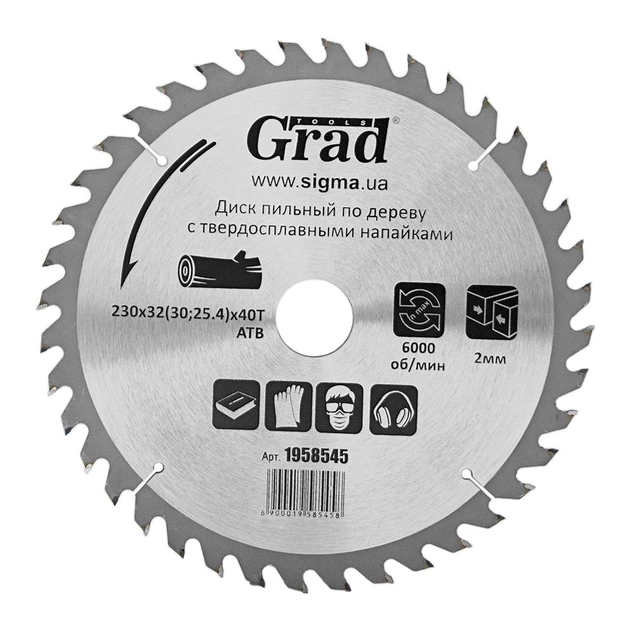 Диск пильний Grad по дереву з твердосплавними напайками Ø230×32(30;25.4)×40Т, 6000об/хв GRAD (1958545) (1958545)