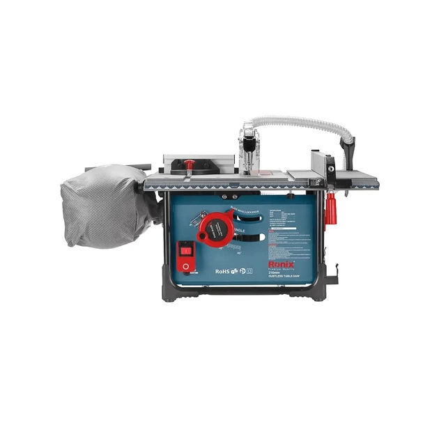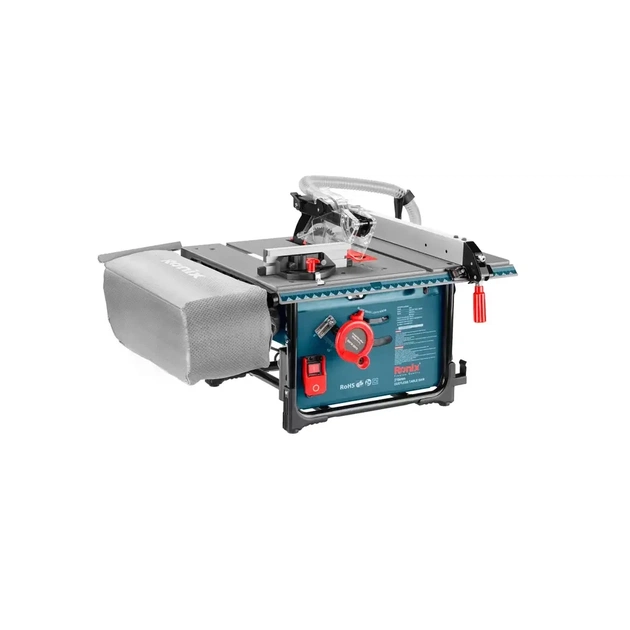 Настільна пила Ronix 5601 упакована в кольорову коробку Ronix, що містить мішок для пилу, трубку для збору пилу, напрямну планку, важіль поперечної напрямної.