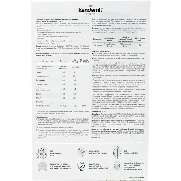 Kendamil — володар найвищої нагороди "Grand gold" незалежної премії "Monde Selection" (2018 та 2021 рр.), а також нагороди Королеви Єлизавети II (2020 р.). Каша отримала срібло MFM Awards 2021 у категорії "Дитяче органічне харчування" за якість інгредієнтів, смак та поживну цінність.