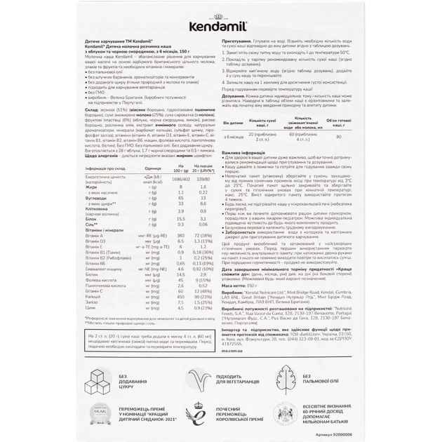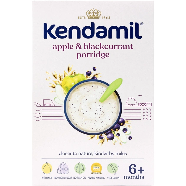 Молочна каша Kendamil зі смаком яблука та чорної смородини виготовлена з вітамінізованим незбираним коров'ячим молоком, без штучних інгредієнтів та цукру. Призначена для дітей з 6 місяців та для вегетаріанського харчування.