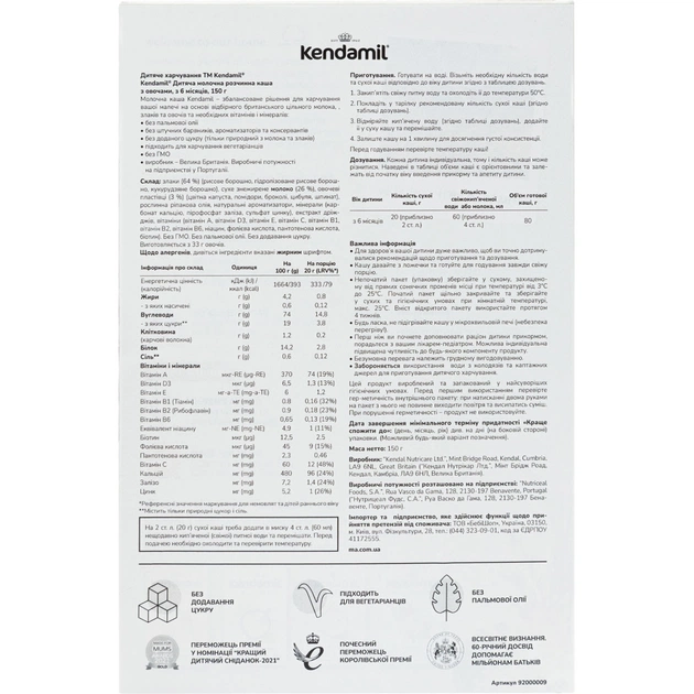 Kendamil — володар нагороди "Grand gold" премії "Monde Selection" (2018, 2021 рр.) та нагороди Королеви Єлизавети II (2020 р.). Каша отримала золото MFM Awards 2021 за якість інгредієнтів та поживну цінність.