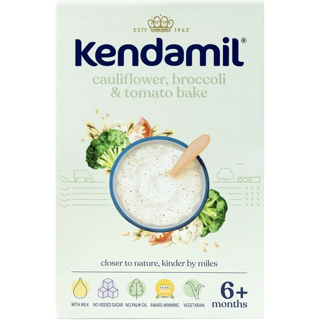 Молочна каша Kendamil з цвітною капустою, броколі та томатами виготовлена з вітамінізованим незбираним коров'ячим молоком, без штучних інгредієнтів та цукру. Призначена для дітей з 6 місяців та підходить для вегетаріанського харчування.