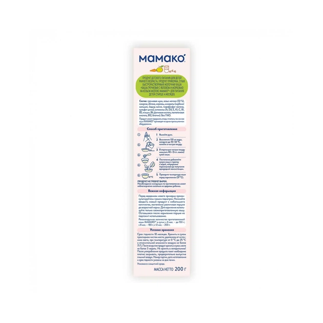 Швидкорозчинна каша на козячому молоці Мамако гречана з яблуком і морквою виготовлена за унікальною рецептурою. Створює хороший апетит і поповнює нестачу заліза. Велика кількість цінних рослинних білків гречки покращує розвиток м'язових тканин і сприяє своєчасному формуванню рухових навичок. Високий вміст природного заліза в гречаній крупі і яблуці покращує надходження кисню до головного мозку, стимулює розвиток пам'яті і мозкової діяльності. Натуральні яблука та моркву перетворюють кашу в корисне ласощі.