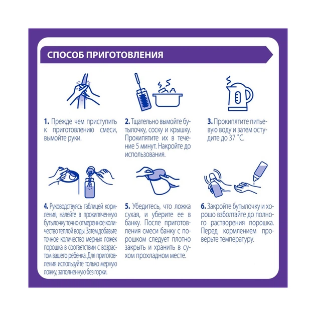 Попередження: Суміш слід готувати безпосередньо перед кожним годуванням. Точно дотримуйтесь інструкції. Готова суміш, що залишилася після годування, не повинна зберігатися і використовуватися в подальшому. Під час годування необхідно підтримувати дитину, щоб вона не захлинулась. Коли дитина підросте, переходьте на годування з чашки. Попередження: Використання некип'яченої води і непрокип’ячених пляшечок, неправильне зберігання, транспортування, приготування і годування можуть несприятливо вплинути на здоров'я дитини. Забороняється використання води з колодязiв та каптажних джерел для приготування дитячого харчування.