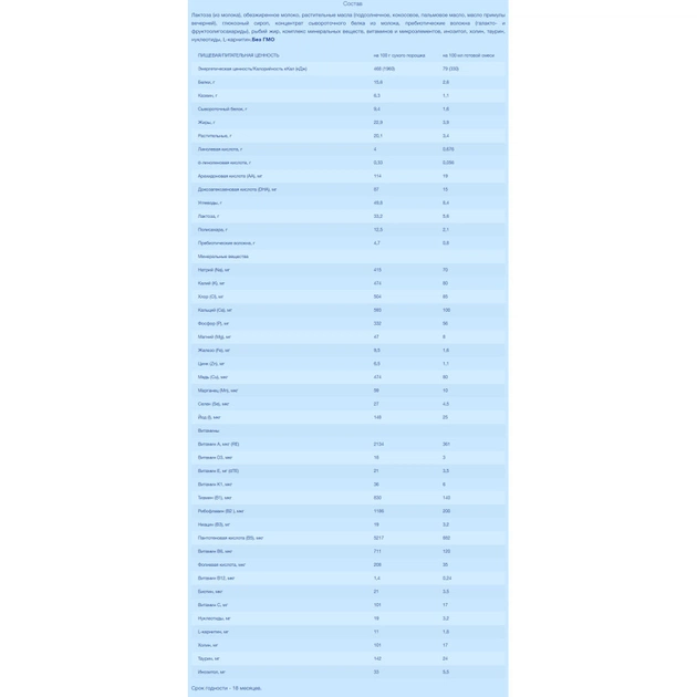 Білок в кількості 2.6 г/100 мл забезпечує необхідну кількість речовин для розвитку вашого малюка.