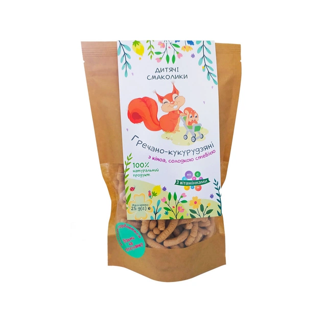 Палички неглазуровані Дитячі Смаколики Гречано-кукурудзяні з кіноа, солодкою стевією і вітамінами 25 г — натуральні безглютенові смаколики, що містять краще з найцінніших злаків: гречки, кукурудзи і кіноа. Продукт не містить цукру, штучних добавок, барвників або консервантів. Ви не знайдете таких смаколиків для сніданку ніде!