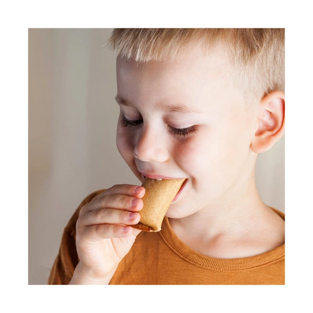 Склад: яблучна паста*, (концентрований яблучний сік*, концентроване яблучне пюре*, агент желюючий (пектин), регулятор кислотності (лимонна кислота)), цільнозернова пшенична мука*, концентрований яблучний сік*, негідрогізовані рослинні олії* (соняшникова*, олія какао*), спельтове борошно*, яйце*, молоко сухе знежирене*, рисове борошно*, натуральний екстракт ванілі*, розпушувач (гідрокарбонат натрію), антиокислювач (концентрат суміші токоферолів). * — органічне сільське господарство відповідає законодавству ЄС (Регламенти ЄС №834/2007, №889/2008). Може містити сліди сої та горіхів.