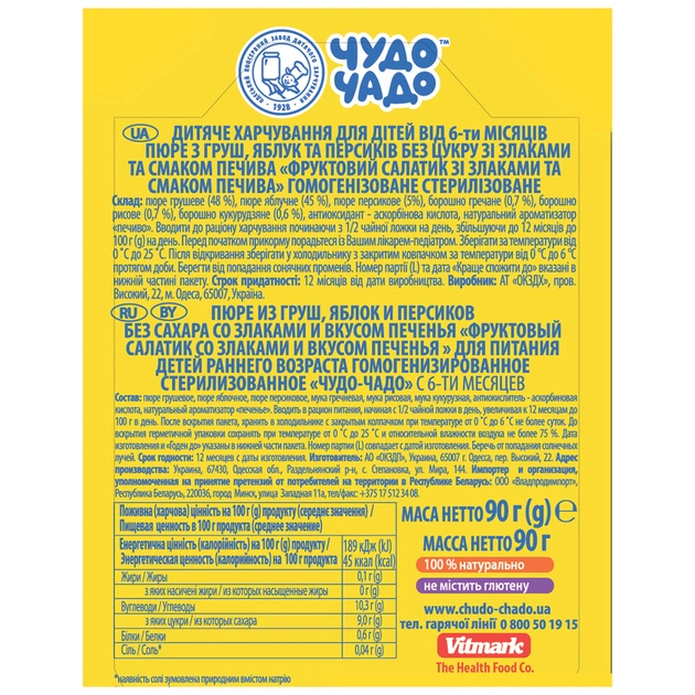 Склад: Пюре з груш, яблук і персиків без цукру зі злаками та смаком печива.