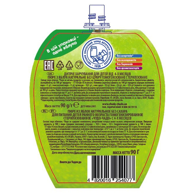 Преміальне Пюре з яблук без цукру Чудо-Чадо 90 г виготовлено на Одеському заводі дитячого харчування з добірних фруктів. Пюре з одного інгредієнта прекрасно підійде в якості першого прикорму для малят від 4 місяців. Пюре в зручній і стильній упаковці у вигляді фрукта — компонента пюре, з кришкою, що закручується. Пюре з яблук без цукру Чудо-Чадо 90 г — тільки натуральні інгредієнти без додавання цукру.