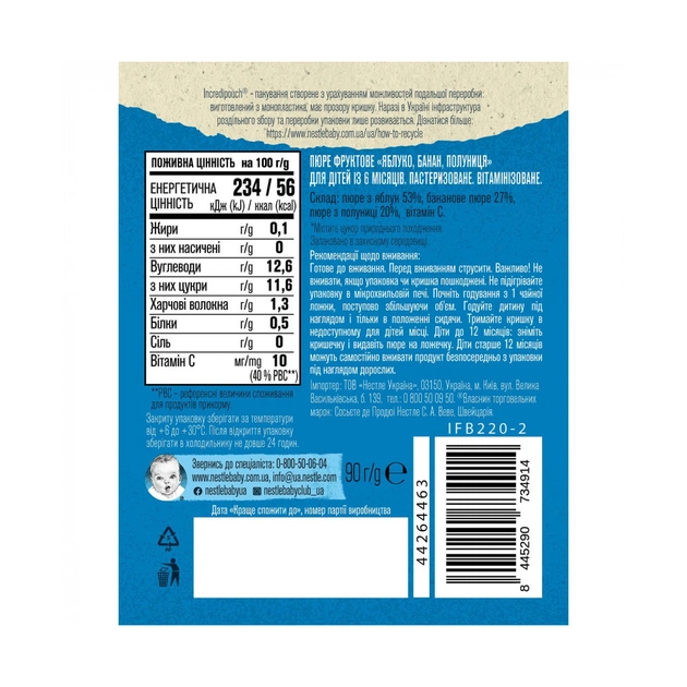 має ніжну, однорідну консистенцію; без додавання цукру, крохмалю; в процесі виробництва пюре проходить ретельні перевірки на відповідність вимогам до дитячого харчування; м'яку упаковку пауч зручно брати з собою в дорогу і на прогулянку.