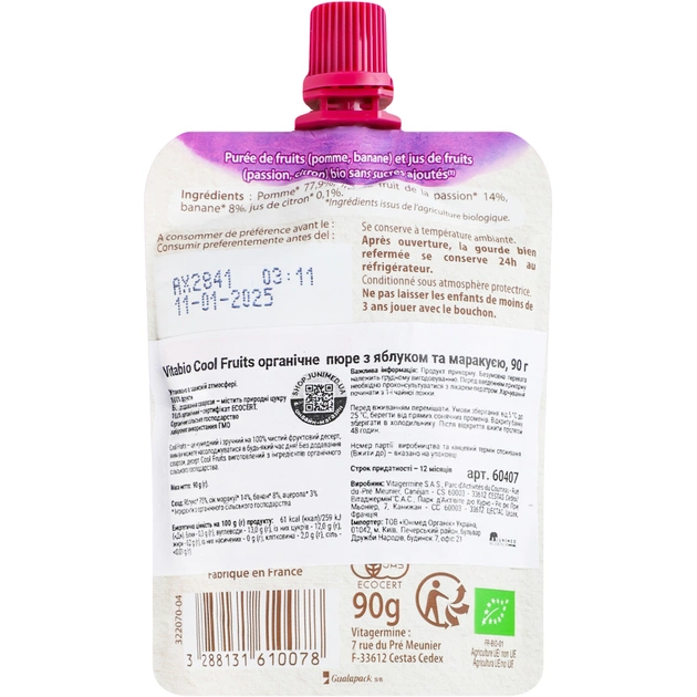 Дитяче пюре Vitabio Cool Fruits органічне з яблуком та маракуєю 90 г (60407)