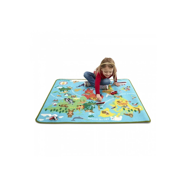 Будьте готові до захоплюючих пригод, що рухаються по світу, завдяки цьому міцному, барвистому ігровому килимку на карті світу! Тканий килим з посиленою обв'язкою на борту та захисною протиковзкою підкладкою, міцно зроблений так, щоб виглядати чудово на безліч майбутніх ігор, має три дерев'яні машини (автомобіль, літак та човен) для подорожей по всьому світу, а також паспорт із наклейками на стежте за відвідуваними місцями! На ілюстрованій карті є позначені континенти та океани, корінні тварини, визначні пам'ятки, роза компаса та багато іншого, що дає безліч варіантів для творчої гри. Великий формат достатньо великий для кількох дітей та багато ігрових п’єс.