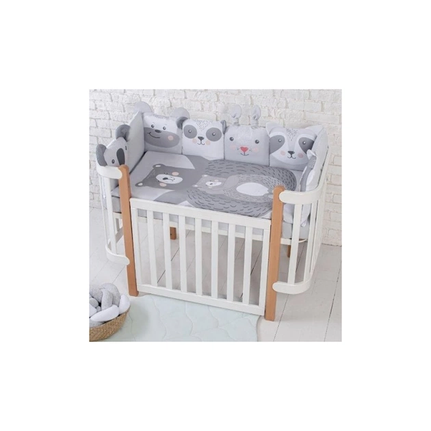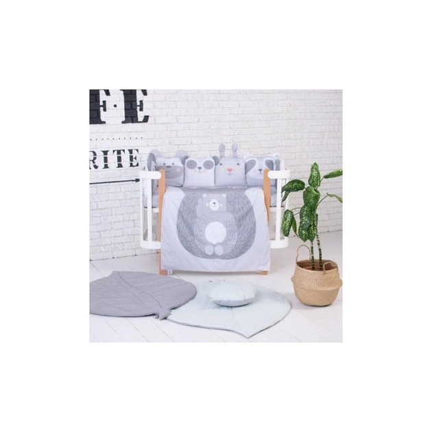 Zoo grey - постільний комплект з колекції Cuties. 6 з 8 подушечок захисту виконані у вигляді мордочок тваринок з об`ємними вушками.