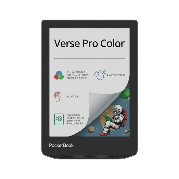 PocketBook Verse Pro Color – 6-дюймовий рідер із найсучаснішим кольоровим екраном E Ink Kaleido 3, створений для захоплюючого читання та прослуховування ауіокниг. Компактний, але потужний Verse Pro Color вражає набором преміальних функцій та характеристик, таких як захист від води IPX8, підтримка аудіокниг та Bluetooth, функція Text-to-Speech, адаптивне підсвічування SMARTlight та чотириядерний процесор.