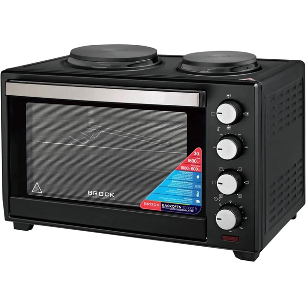 На передній панелі печі розташовані механічний таймер і регулятори температури та режиму роботи. BROCK TO 3002 B пропонує температурний діапазон від 100 до 230°C та п’ять режимів запікання - верхній, нижній, комбінований нагріви та конвекцію при нижньому і комбінованому нагріві.