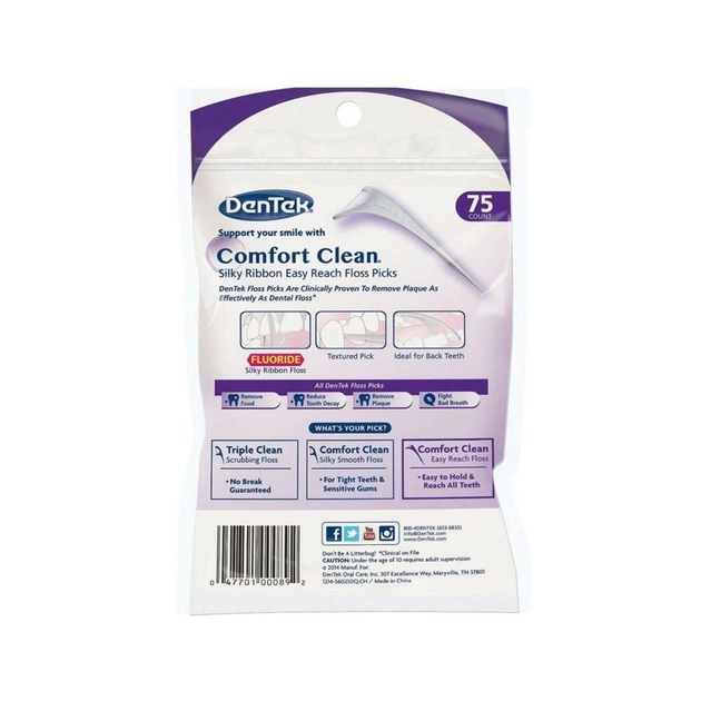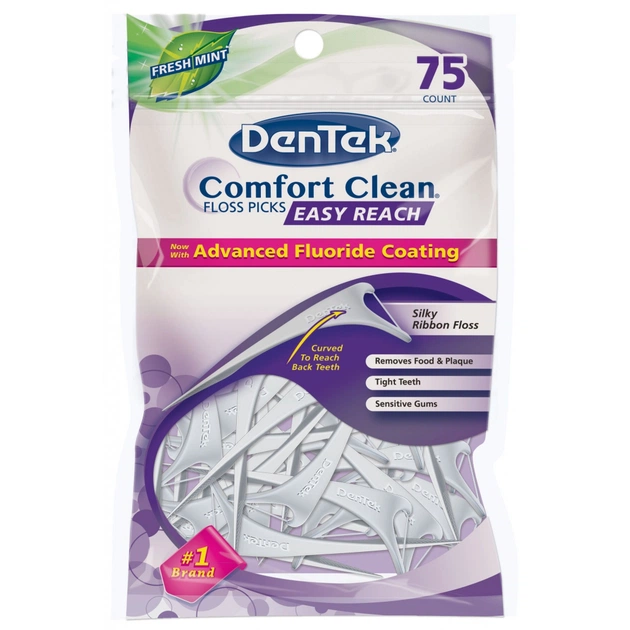 Їжа та зубний наліт полюбляють ховатися на наших задніх зубах. Але з DenTek Комфортне очищення Задні зуби Флос-зубочистки, спеціальної форми для легкого доступу до задніх зубів, вони не зможуть більше ховатися. Підвищений комфорт завдяки шовковому флосу, який легко ковзає між зубами та чутливими яснами. Додайте текстуровану зубочистку, яка глибоко очищає між зубами та не дивно, що клінічні дослідження підтвердили таку саму ефективність цього продукту, як у зубної нитки в рулоні!